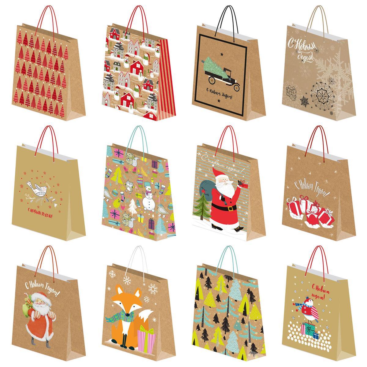 Пакет подарочный бумажный новогодний, крафт, 26x32x12см, праздничный дизайн