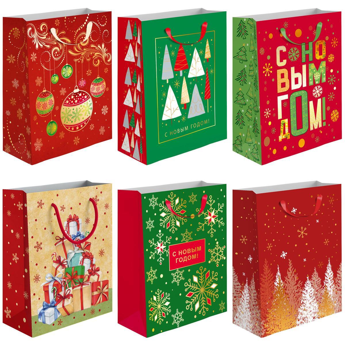 В ассортименте представлены три праздничных цветовых решения: классический красный, насыщенный зеленый и элегантный золотистый. Каждый пакет украшен тематическими новогодними принтами: елочками, снежинками, подарками и поздравительными надписями на русском языке.