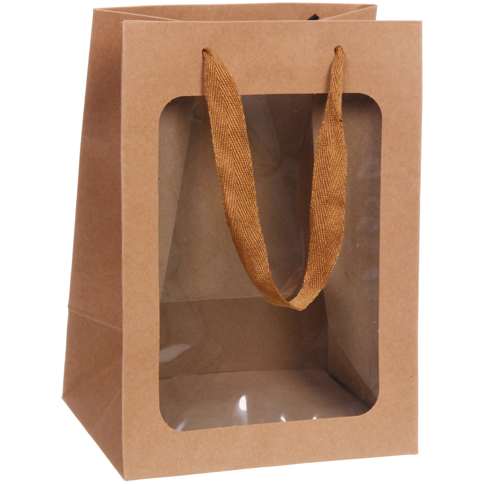 Пакет изготовлен из плотной бумаги крафтового оттенка, что обеспечивает ему жёсткость и устойчивость. Прямоугольная форма с плоским дном гарантирует устойчивость даже с объёмным содержимым. Крупное прозрачное окно с закруглёнными углами занимает центральную часть передней стенки, позволяя видеть содержимое, но не раскрывая его полностью.