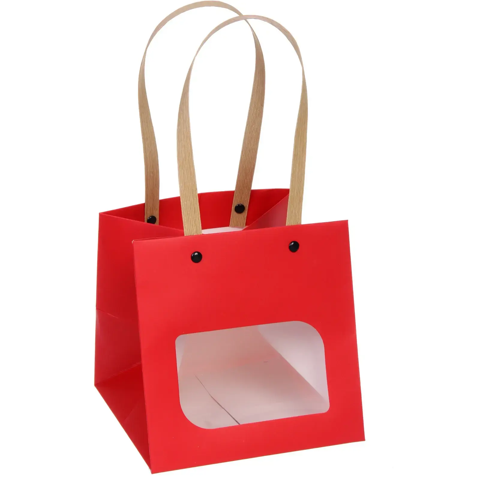 Пакет имеет квадратную форму и размеры 16х16х16 см, что позволяет удобно размещать в нем как небольшие букеты, так и подарки. Открытое окно спереди позволяет видеть содержимое, а ручки, выполненные из материала, имитирующего дерево, обеспечивают надежное удержание. Пакет подходит для использования на праздниках, днях рождения и других торжествах.