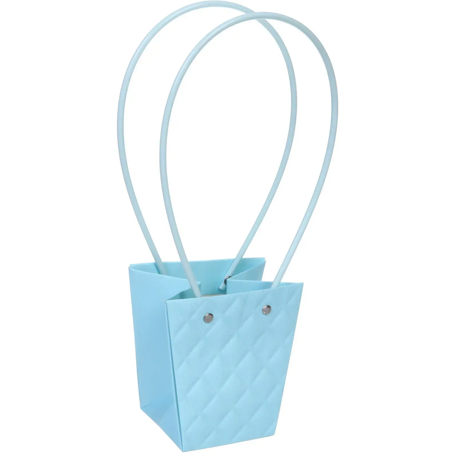 Пакет изготовлен из качественного картона, что обеспечивает его прочность и долговечность. Светло-голубой цвет и текстурированный ромбовидный узор придают ему стильный вид, который привлечет внимание. Благодаря своим характеристикам, он подходит как для личного использования, так и для коммерческих целей, например, в цветочных магазинах или на мероприятиях.