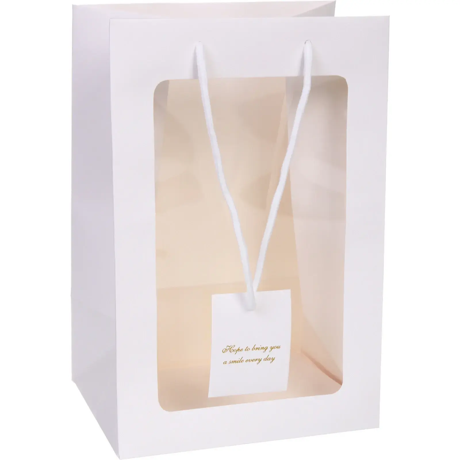 Размеры пакета составляют 20 см в ширину, 15 см в глубину и 30 см в высоту. Белый цвет и простая форма делают его идеальным фоном для любых подарков, а прикрепленный ярлык с надписью «Hope to bring you a smile every day» добавляет нотку тепла и заботы. Выбирайте пакет «Шарм» и радуйте своих близких стильной упаковкой!