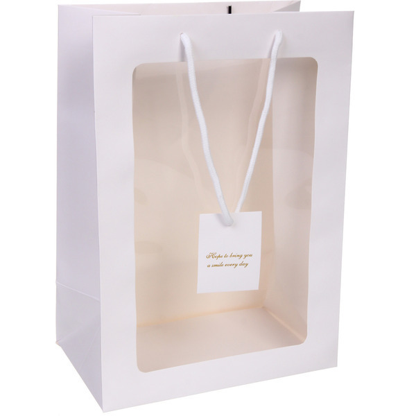 Почему стоит выбрать именно этот пакет? Во-первых, он изготовлен из качественного картона, что обеспечивает его прочность и долговечность. Во-вторых, его гладкая поверхность и прозрачная вставка придают ему изысканный вид. Ручки из белого каната обеспечивают удобство при переноске, а этикетка с надписью «Hope to bring you a smile every day» добавляет особый шарм и позитивный настрой.