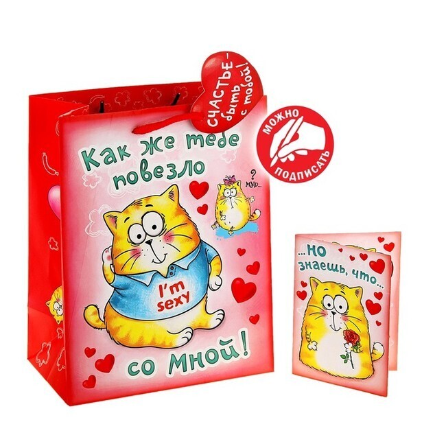 Подарочный пакет с открыткой «Как же тебе повезло со мной», бумага, 23х18 см, красный с белым