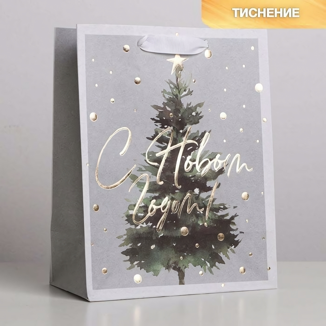 Создайте праздничное настроение с нашим крафтовым пакетом "Сказочная ёлочка". Идеально подходит для упаковки новогодних подарков, добавляя им очарования и тепла. Серый фон с золотистыми надписями и блестящими элементами декора создают атмосферу волшебства и радости.