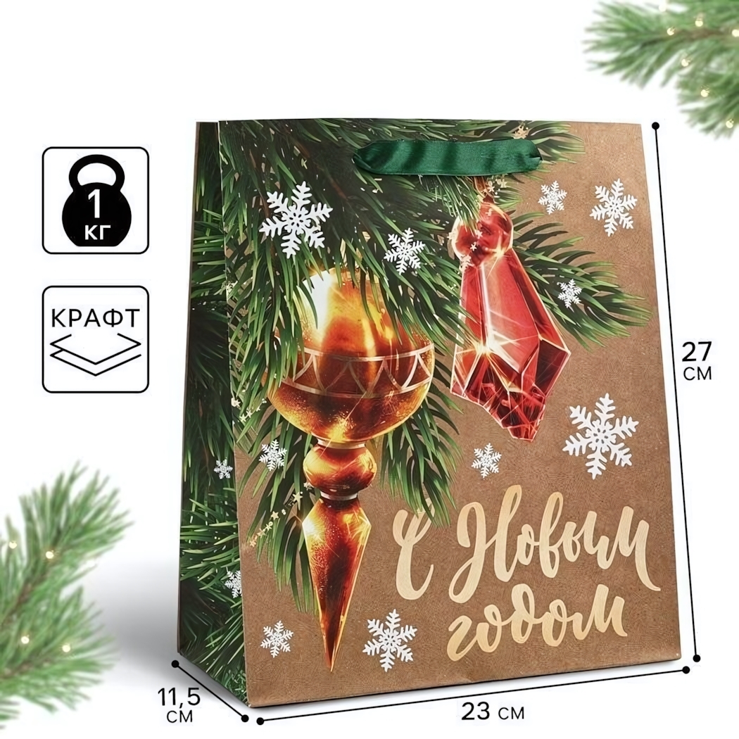 Пакет крафтовый «С Новым годом» 23×27×11.5см, зелёные ручки, дизайн с игрушками — Дарите Счастье