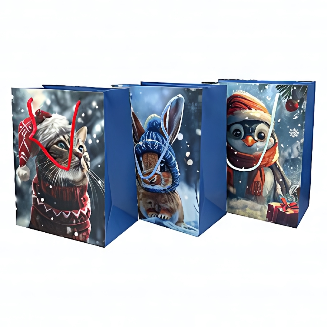 Вертикальный пакет «новогодний милашки» превращает обычный подарок в яркое событие. Яркие иллюстрации животных в зимних шапках создают праздничное настроение, а качественная ламинированная бумага защищает содержимое от повреждений.