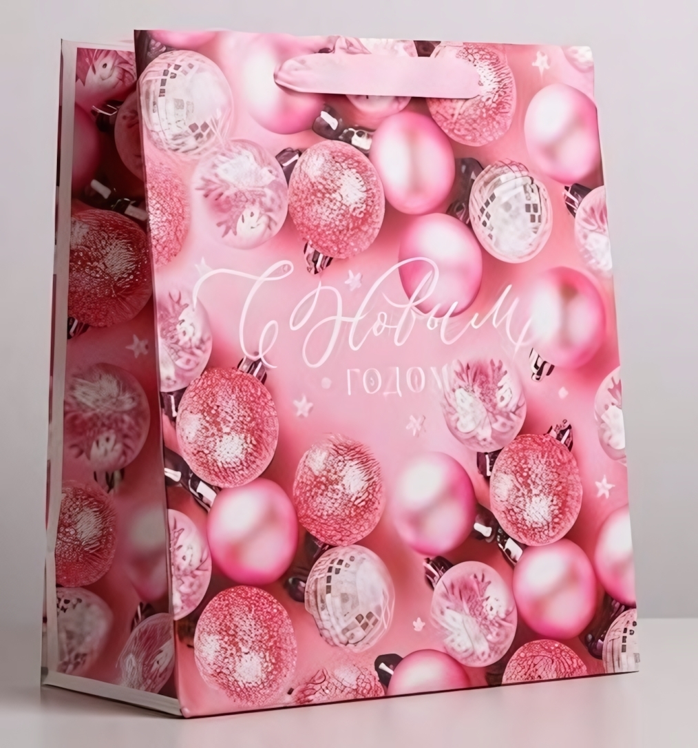 Пакет подарочный ламинированный "Розовые шарики", 23х27х11.5см, новогодний дизайн, для подарков
