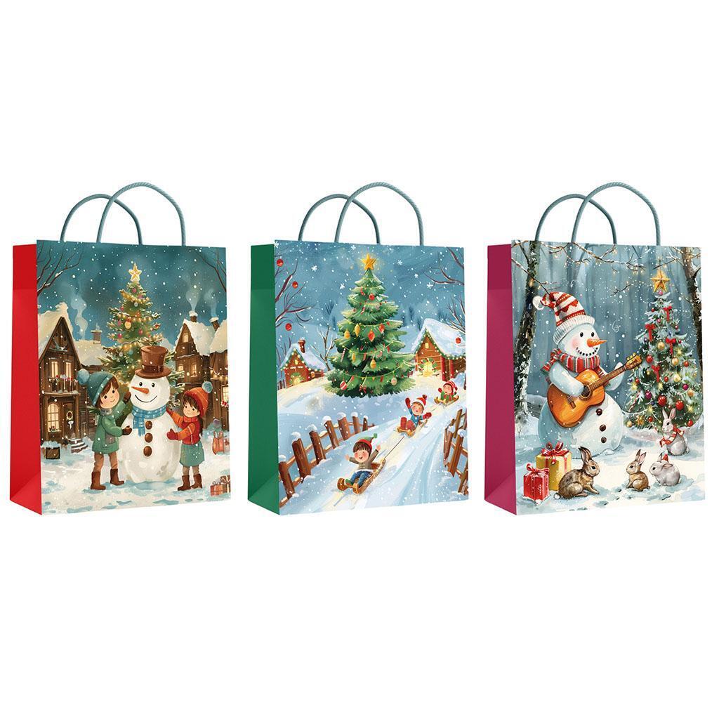 Этот высококачественный ламинированный подарочный пакет выполнен из плотной бумаги 210 г/м2 и идеально подойдет для презентаций, сувениров и подарков на новогодние и зимние праздники. Его яркий дизайн с изображениями снеговиков, елок и праздничных элементов создаст уютную атмосферу и подчеркнет особенность подарка.
