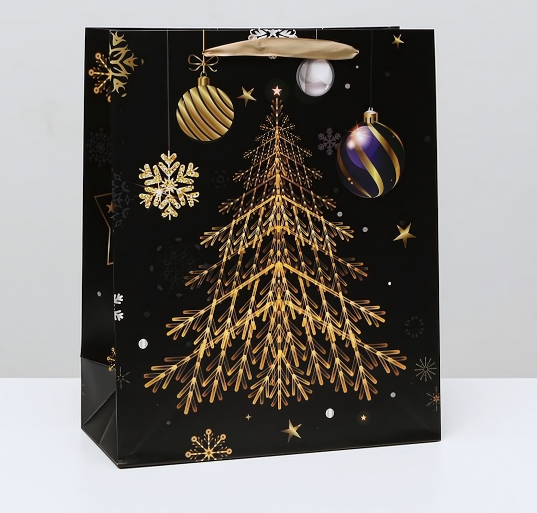 Подарочный пакет "Золотистая ёлка" станет идеальным решением для тех, кто ценит красоту и качество в деталях. Чёрный фон с золотыми акцентами подчеркнёт презентабельность вашего подарка.