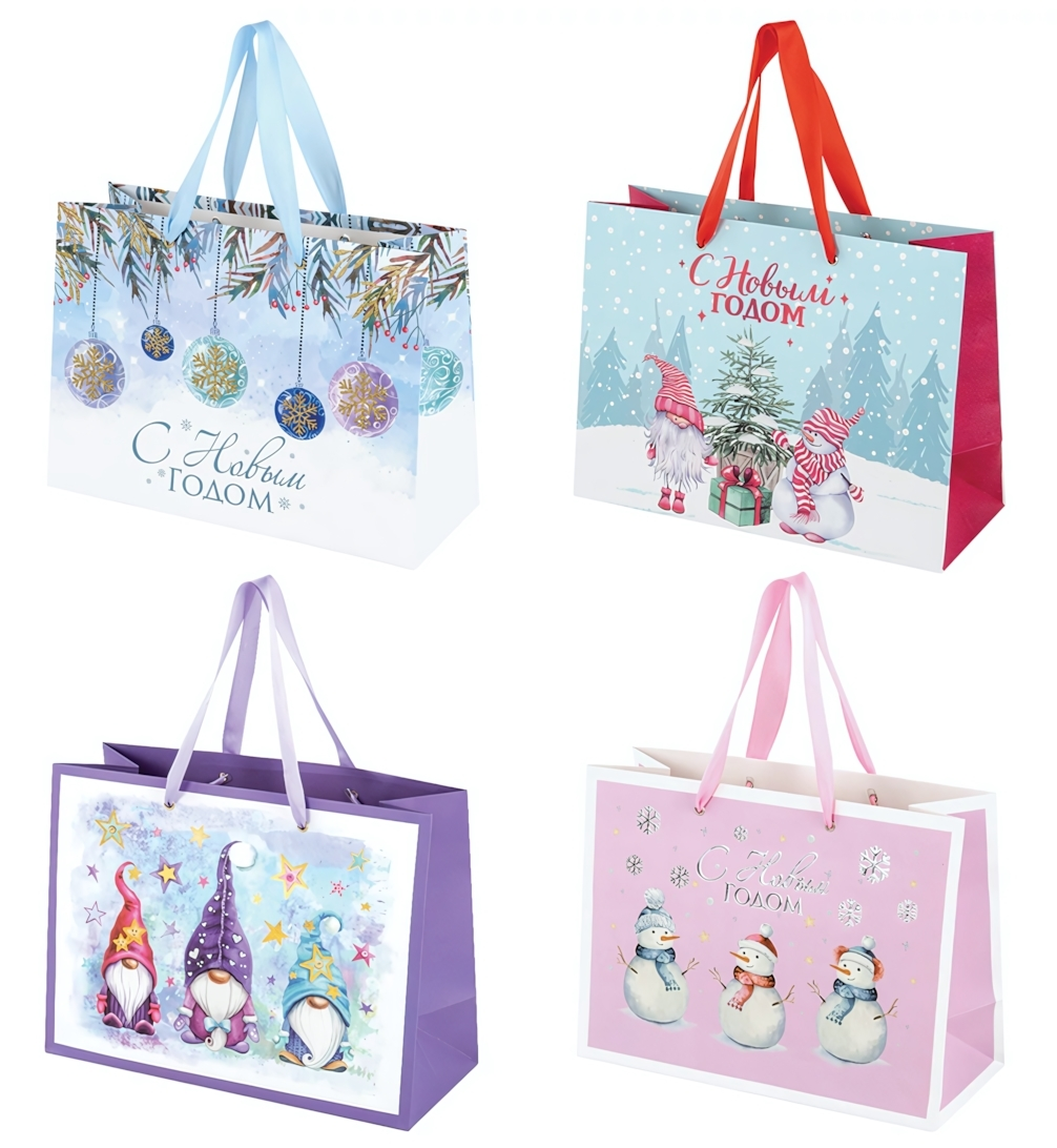 Пакет выполнен из ламинированного мелованного картона, что придает изделию прочность и эстетичный внешний вид. Удобные лента-ручки из полиэстера позволяют легко переносить даже тяжелые подарки. В дизайне использованы изображения новогодних атрибутов, такие как еловые ветки, ёлочные игрушки, а часть элементов украшена тиснением фольгой или глиттером, создавая праздничное настроение.