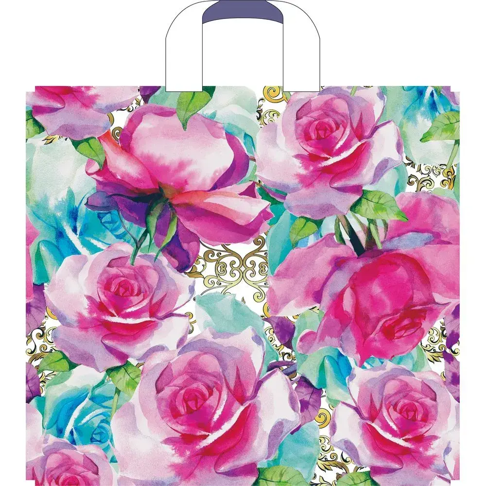 Стилизованный цветочный орнамент создает праздничное настроение, а отсутствие брендинга позволяет использовать пакеты для любых целей. Внутренний белый фон подчеркивает содержимое, сохраняя интригу до момента вручения.