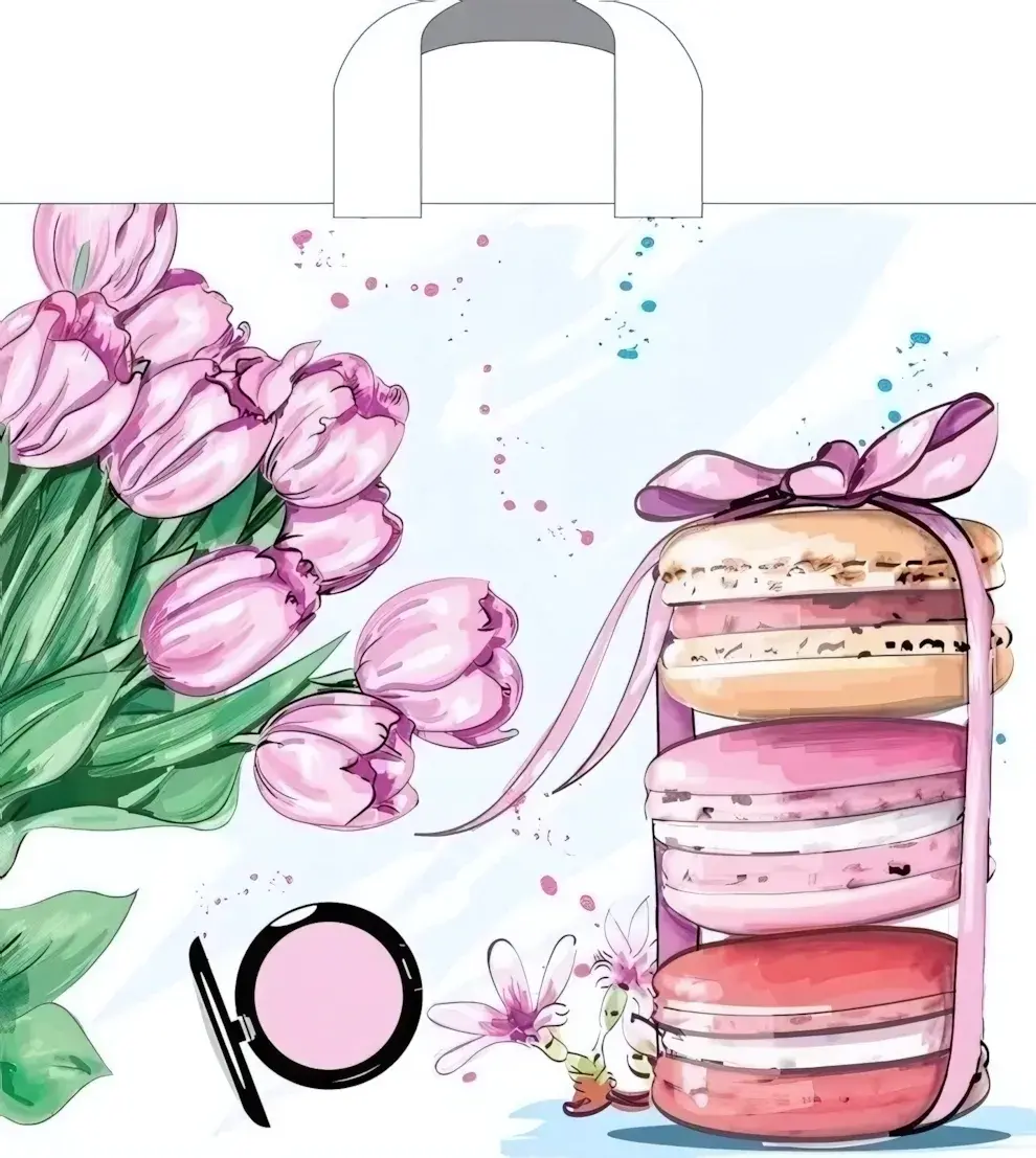 Этот пакет с петлевой ручкой станет отличным решением для упаковки подарков и товаров. Его яркий дизайн с изображениями розовых тюльпанов и макаронов создаст праздничное настроение и подчеркнет вашу заботу о близких. Пакет выполнен из качественного полиэтилена, что обеспечивает его прочность и долговечность.