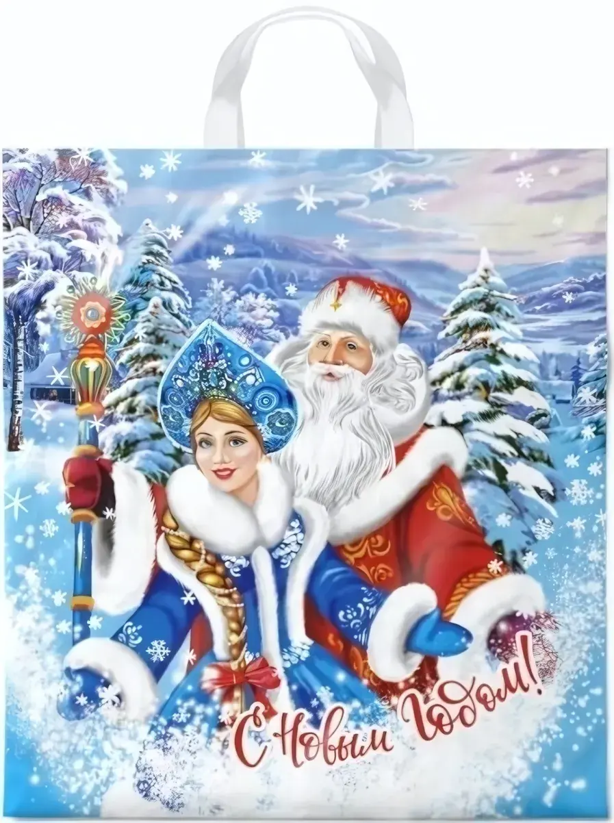 Новогодний пакет с ярким зимним дизайном станет идеальным решением для красивой упаковки ваших подарков. Забудьте о скучных однотонных пакетах – этот вариант с изображением Деда Мороза и Снегурочки создаст атмосферу волшебства.
