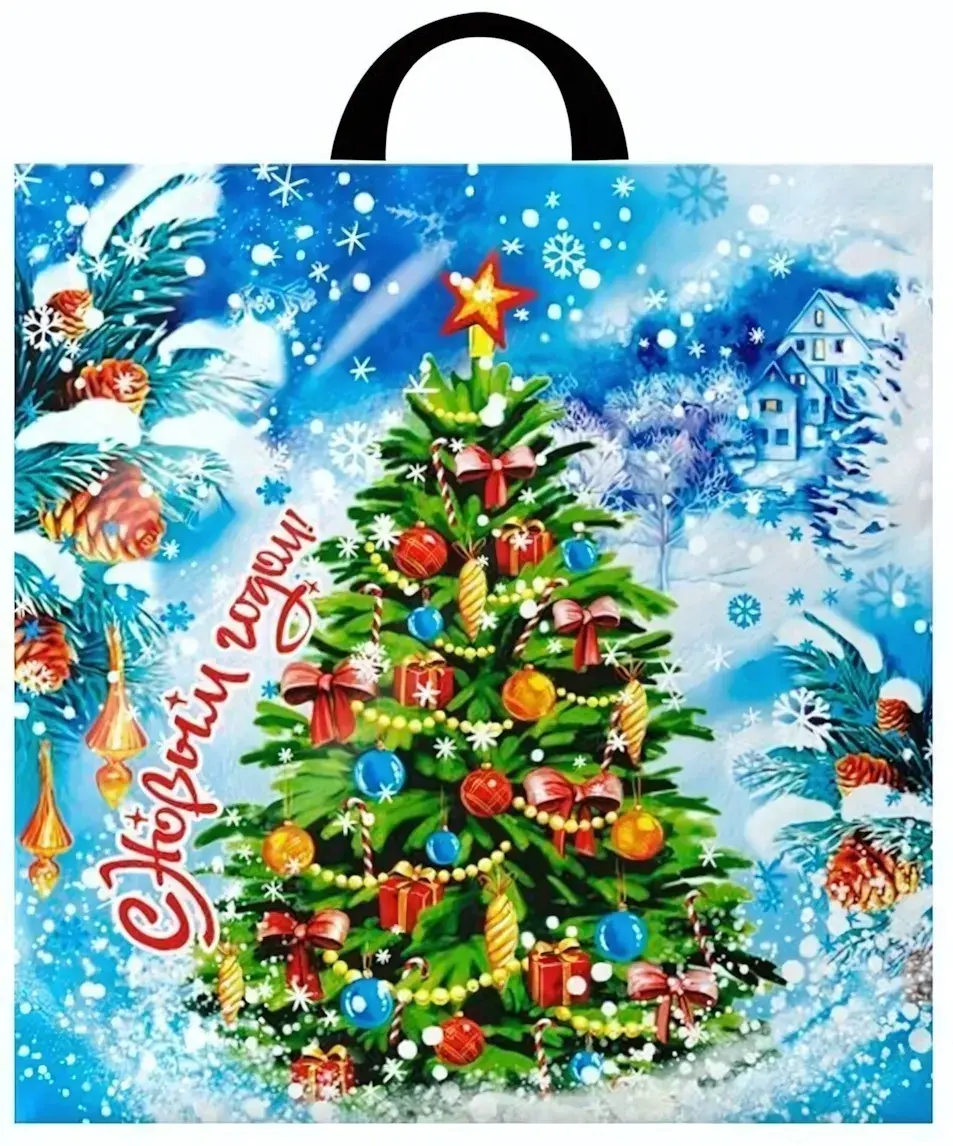 Праздничный дизайн с надписью 'С Новым годом!' и зимним пейзажем создаст особое настроение при любых покупках. Многоразовое использование делает пакет практичным решением для новогоднего сезона.