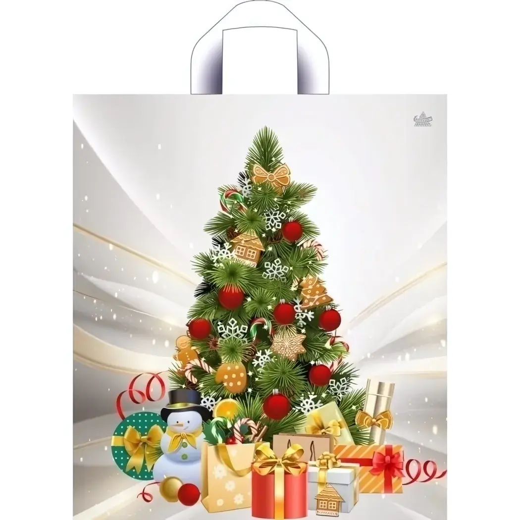 Добавьте уюта и праздничного настроения вашим новогодним покупкам с этим пакетом с петлевой ручкой. Яркий дизайн с изображением нарядной ели, украшенной шарами, бантиками и снежинками, создаёт ощущение волшебства и праздника при каждом использовании. Белый фон с красочными деталями и образ снеговика делают аксессуар универсальным как для взрослых, так и для детей.