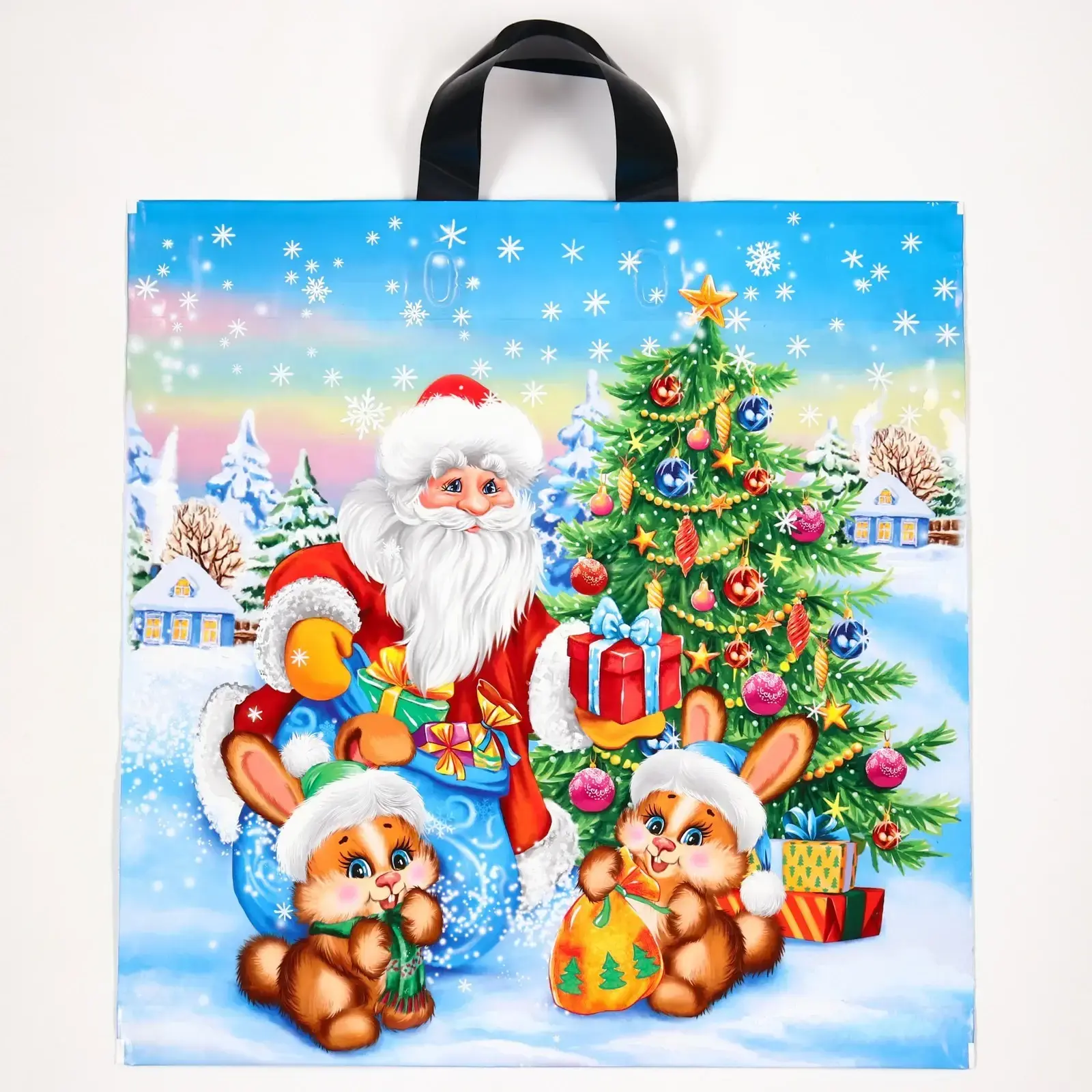 Пакет ПЭ с петлевой ручкой — это не просто упаковка, а стильный аксессуар для вашего Нового Года. Яркий рождественский дизайн с изображением Деда Мороза, зайцев и елки создаст праздничное настроение и добавит волшебства в ваши покупки. Этот пакет станет отличным решением для упаковки подарков, продуктов или других мелочей, которые вы хотите подарить своим близким.