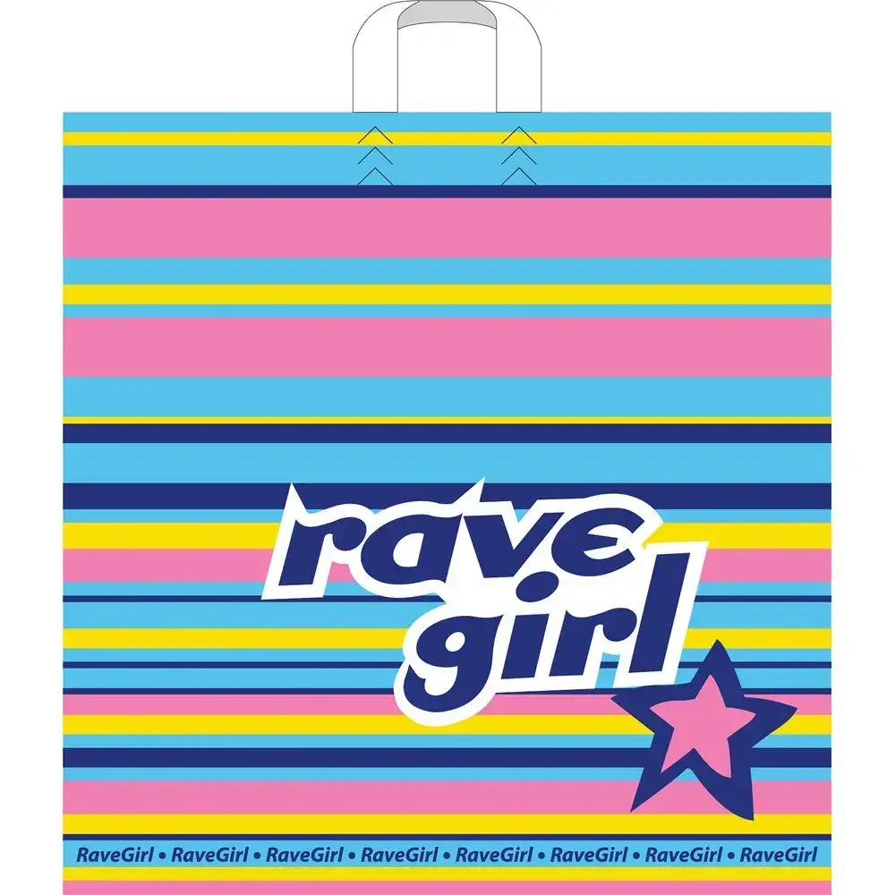 Яркий принт с надписью RaveGirl и градиентными полосами превращает обычный пакет в модный аксессуар. Горизонтальное расположение цветовых зон (голубой, розовый, желтый, синий и фиолетовый) создает динамичный образ, а контрастная надпись привлекает внимание.