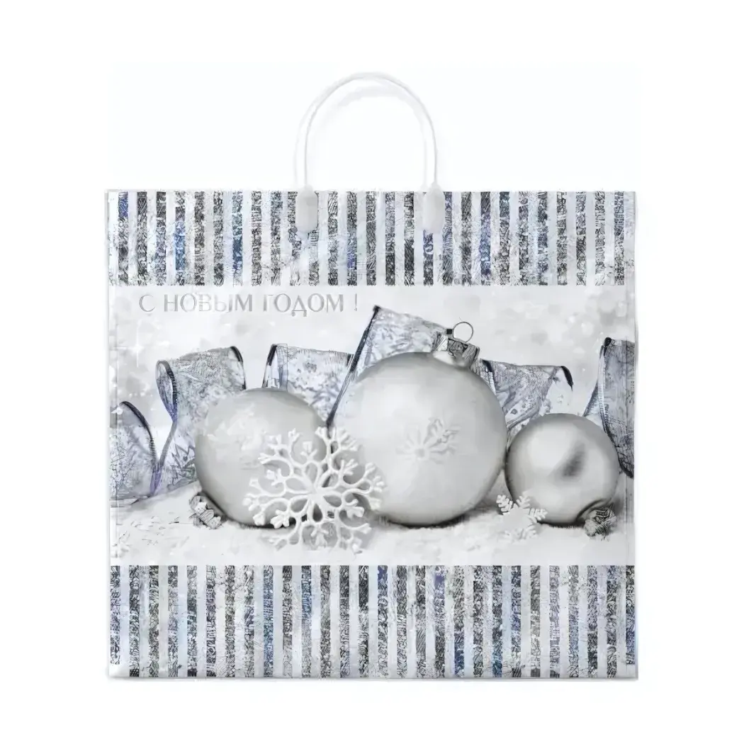 Подарочный пакет новогодний ламинированный, комплект 10 шт, 38+10 см, пластиковые ручки, серебристый дизайн