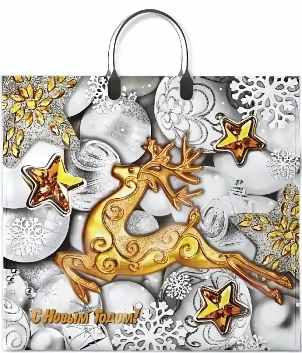 Подарите своим покупателям волшебство праздника – удобный пакет из прочного полиэтилена с ламинированной поверхностью, который защищает подарок и подчёркивает новогодний стиль.