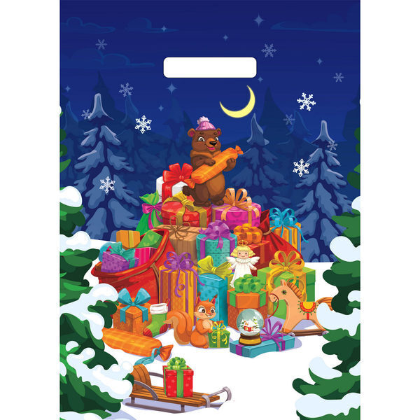 Создайте атмосферу праздника с нашим пакетом ПЭ с вырубной ручкой. Яркий и красочный дизайн с изображением медведя на фоне подарков и снежных деревьев сделает ваш подарок ещё более привлекательным. Этот пакет идеально подходит для упаковки новогодних подарков, а также для использования на различных мероприятиях и праздниках.