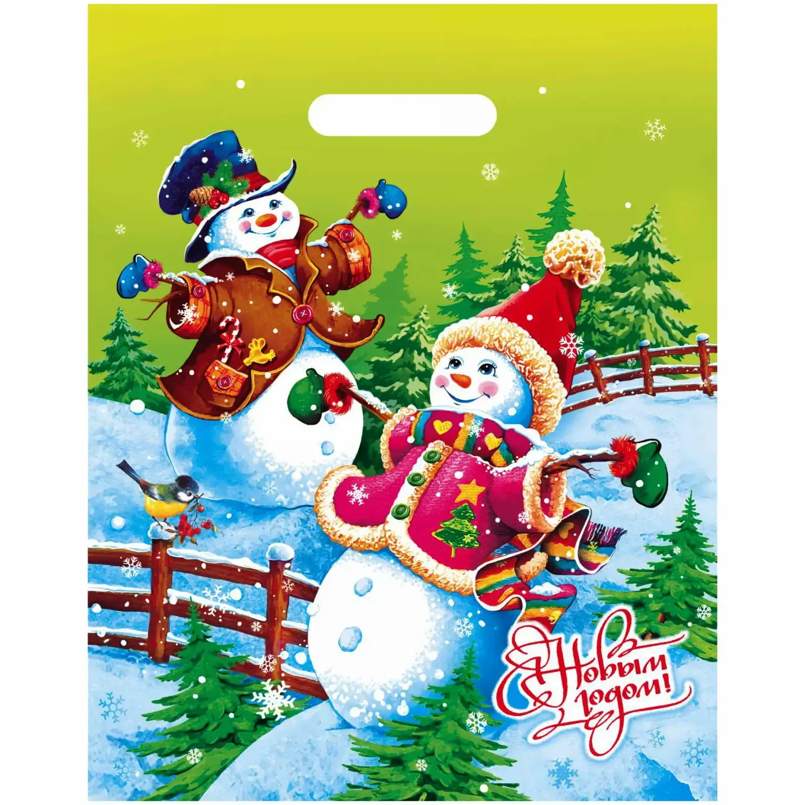 Этот пакет станет незаменимым атрибутом вашего Нового года. С его помощью вы сможете стильно упаковать подарки для близких и друзей, создавая атмосферу праздника и радости. Яркий зеленый фон с изображением снеговиков и снежинок добавляет волшебства в каждый момент. Пакет оформлен надписью 'С Новым годом!', что делает его отличным выбором для подарков.
