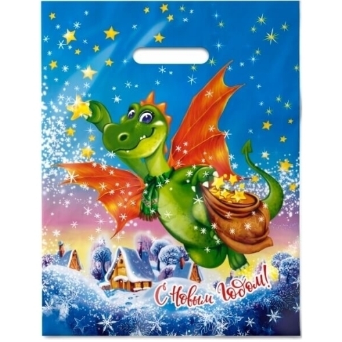 Подарите своим близким радость с помощью нашего пакета ПЭ с вырубной ручкой. Этот стильный пакет с ярким новогодним дизайном станет отличным дополнением к любому подарку. С голубым фоном и изображением милого дракона, держащего мешок с золотыми звездами, он создаст атмосферу праздника и волшебства. Размер 31х40 см позволяет удобно упаковать подарки различного формата, а ламинированная поверхность обеспечивает долговечность и защиту от повреждений.