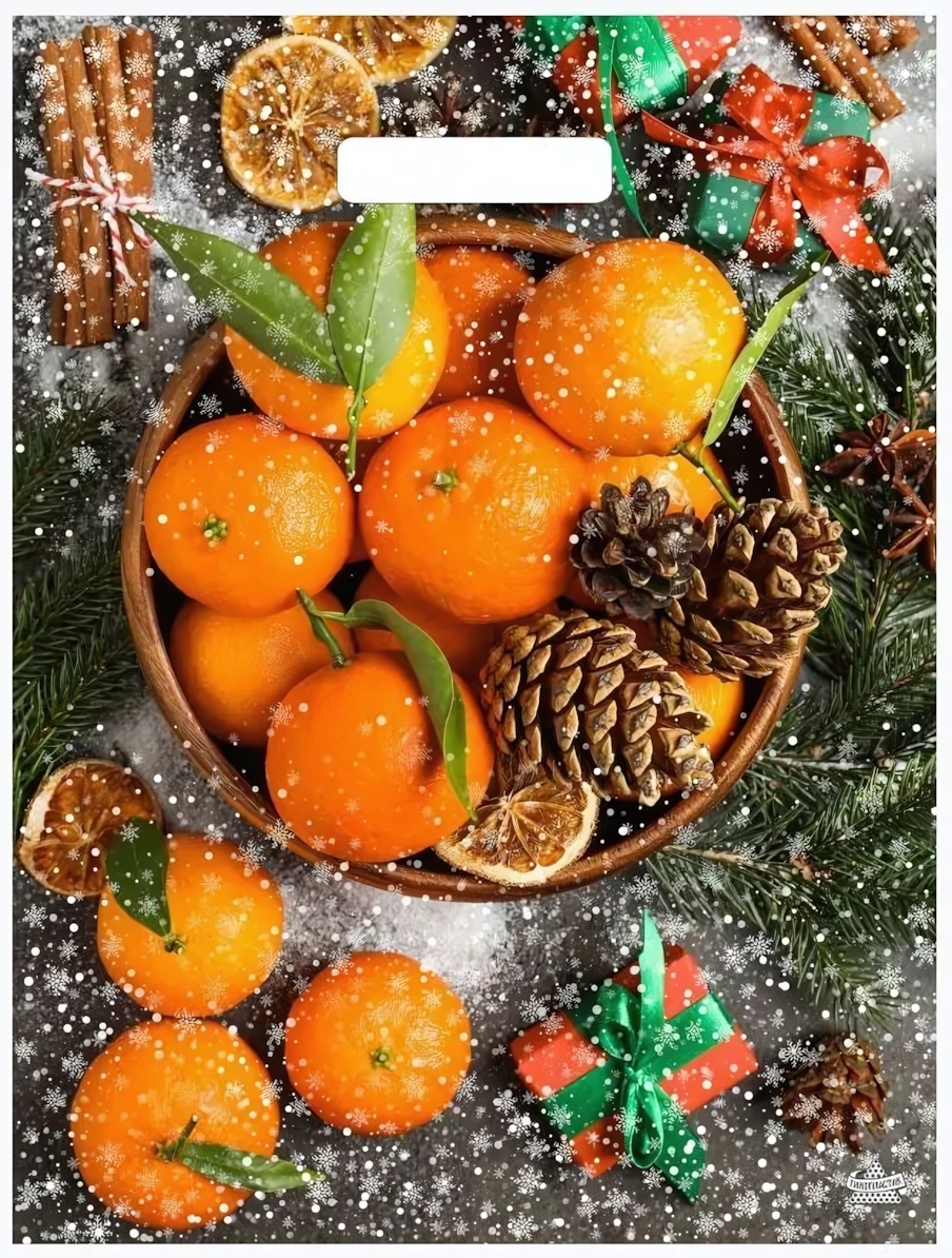 Создайте праздничное настроение уже при вручении подарков! Пакет ПЭ с вырубной ручкой украшен ярким новогодним принтом 'Мандарины', который подчеркнет вашу заботу о деталях.