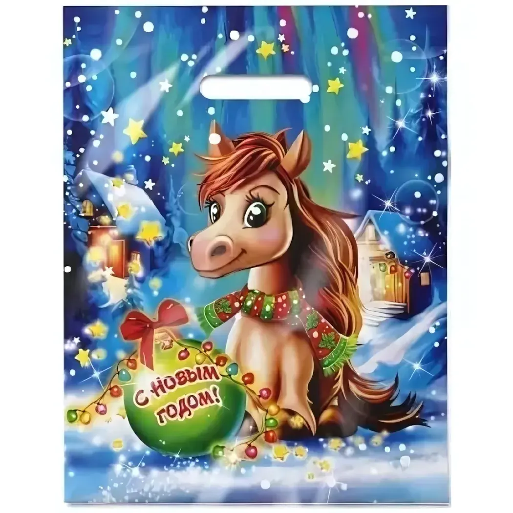 Создайте атмосферу зимнего праздника уже с первых покупок или подарков, выбрав яркий пакет с лошадкой в заснеженном пейзаже. Голубой фон со снежинками и звездами, праздничная надпись «С Новым Годом!» и теплые цвета рисунка создают настроение уюта и радости.