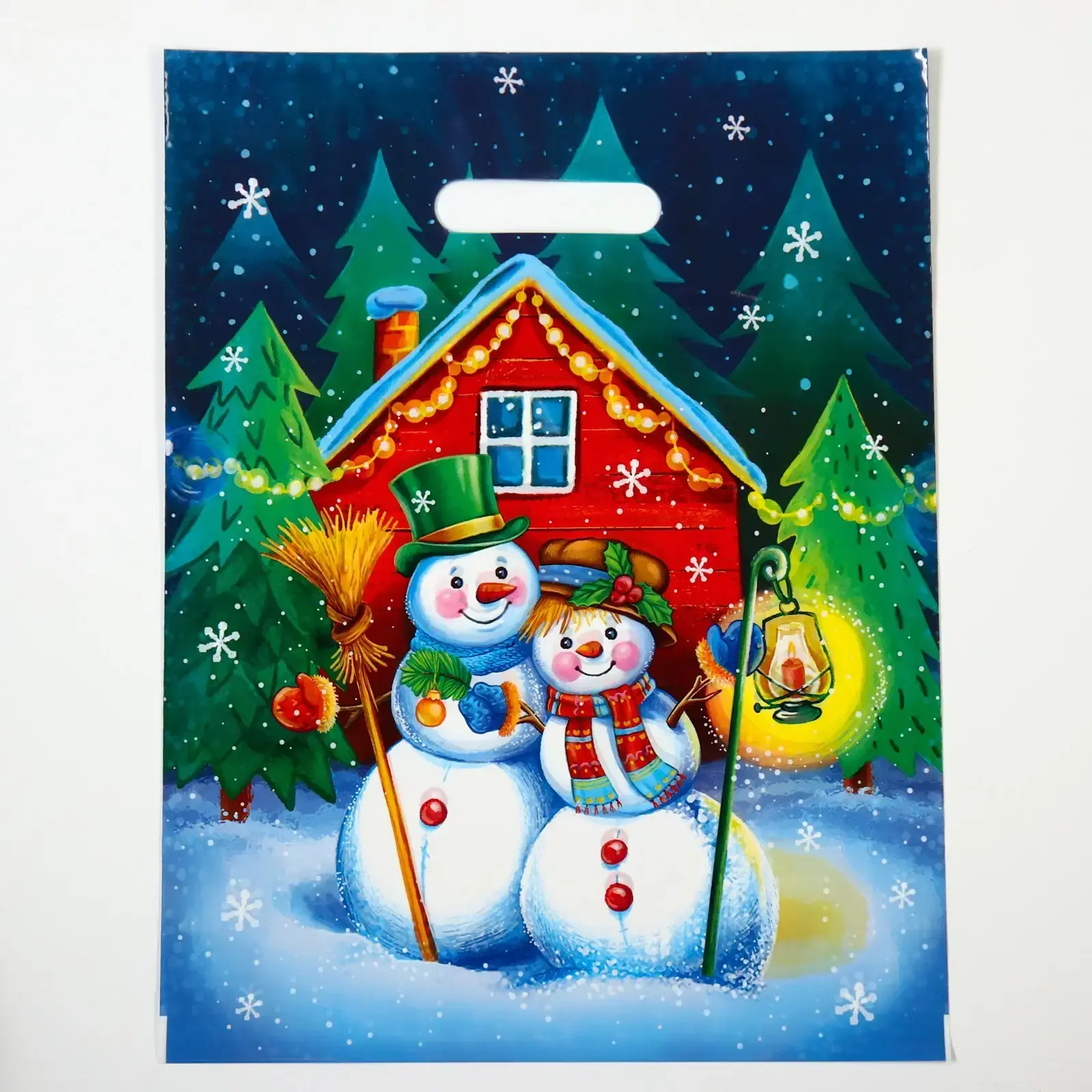 Создайте волшебное настроение с ярким пакетом, украшенным очаровательными снеговиками и зимним пейзажем! Идеальный вариант для упаковки подарков, сладостей или новогодних сюрпризов.