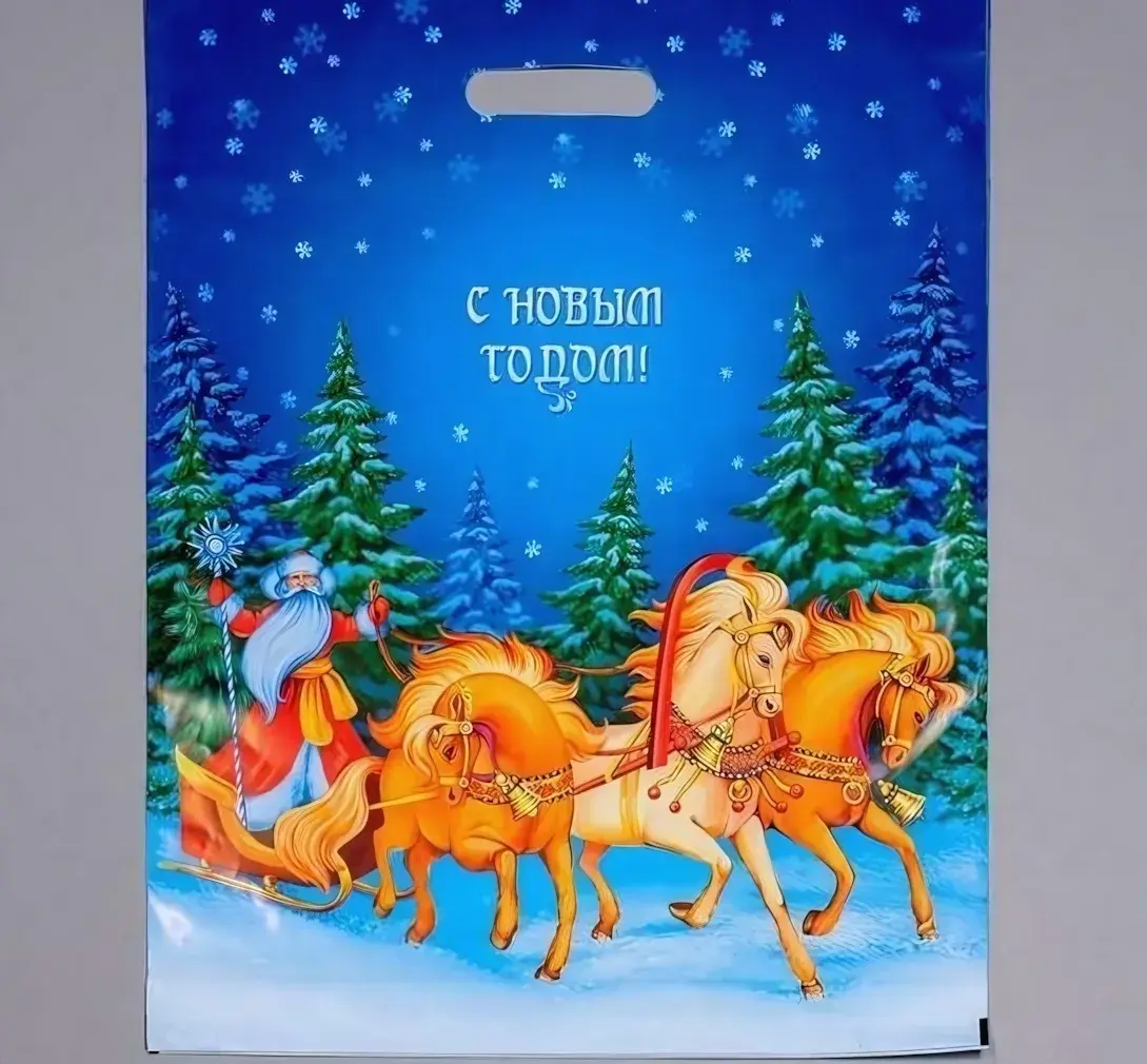 Новогодний пакет с вырубной ручкой станет идеальным решением для стильного подарка. Его яркий дизайн с изображением тройки коней и Деда Мороза создаст атмосферу волшебства и радости.