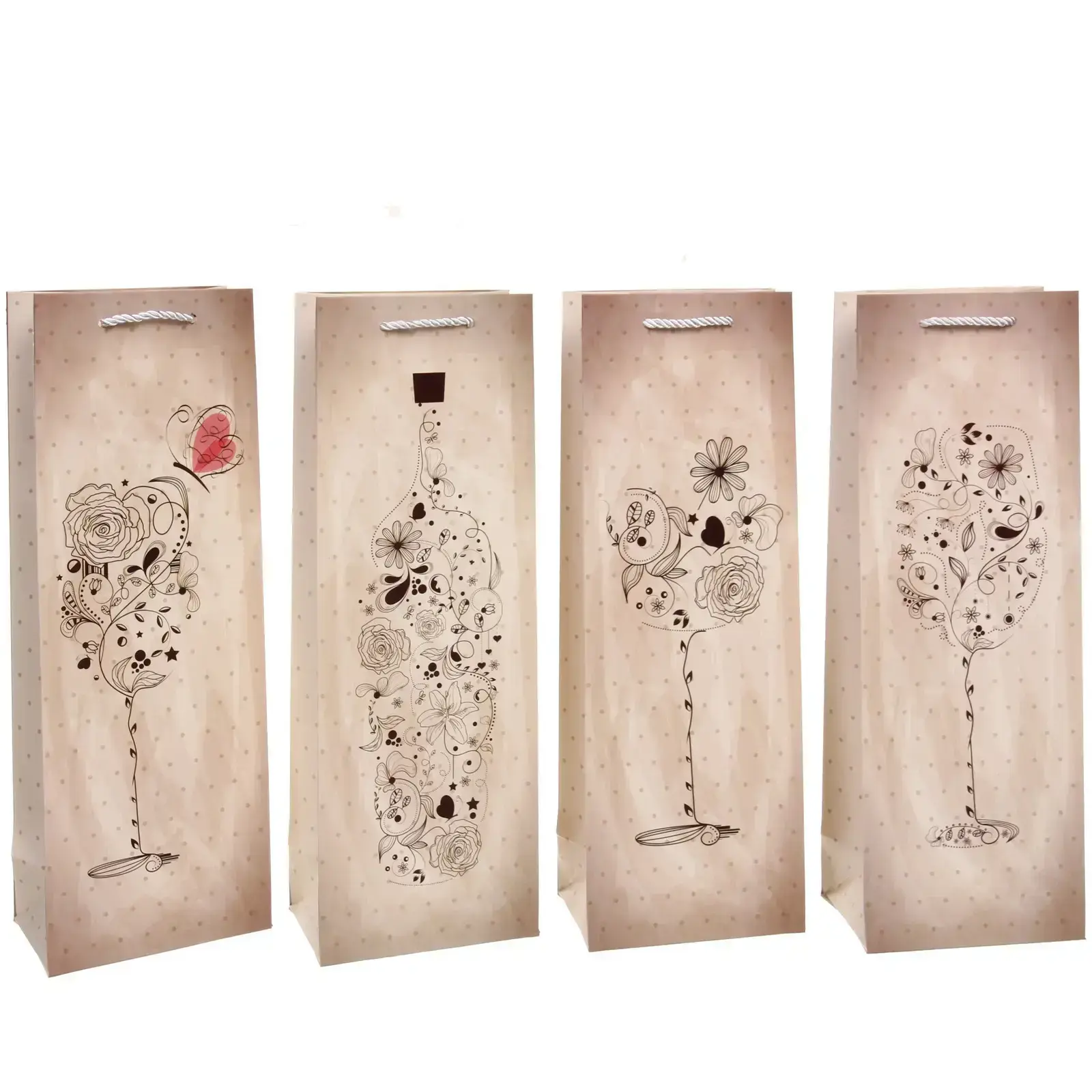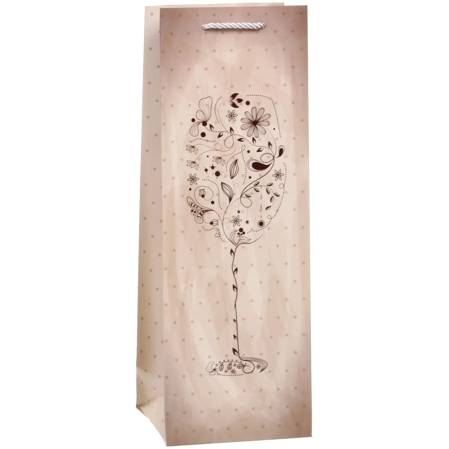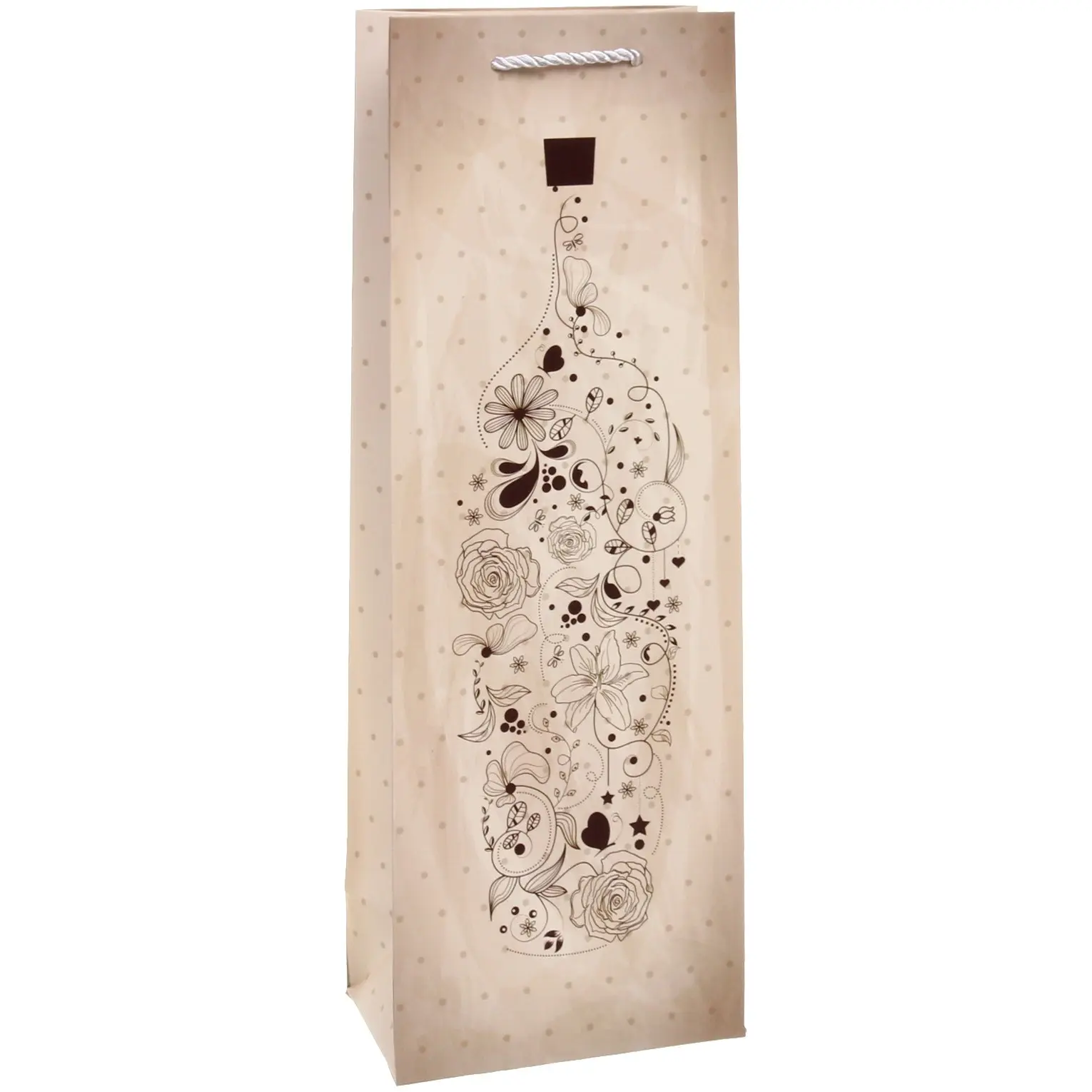 Пакет имеет размеры 36х12,5х8,5 см, что позволяет легко разместить в нем стандартные бутылки. Удобная ручка из веревки обеспечивает комфорт при переноске, а стильный дизайн с цветочными мотивами добавляет эстетическую привлекательность. Этот пакет станет отличным дополнением к вашему подарку, подчеркивая его значимость и индивидуальность.