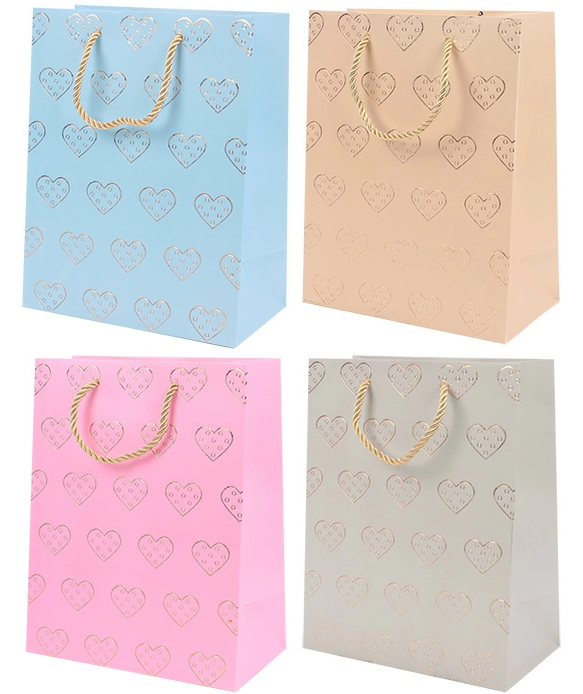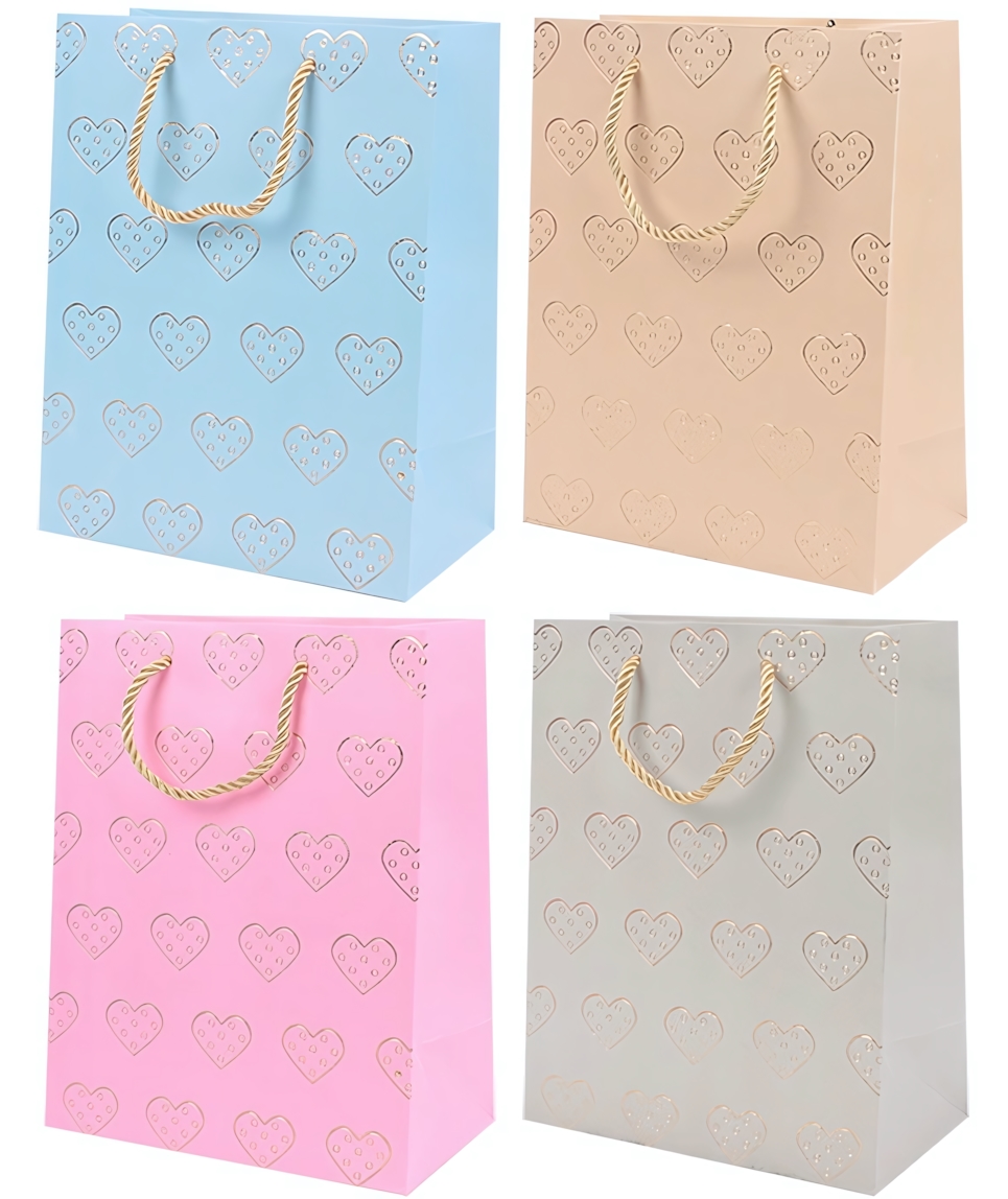 Пакет представлен в разных цветах: отгружается один товар, цвет определяется случайным образом из доступных вариантов. Каждый вариант оформлен золотым тиснением с повторяющимся узором в виде сердец, что придает упаковке нежность и праздничность.