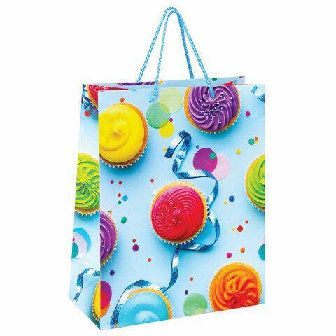 Подарочный пакет "Кексики" ламинированный, 26x13x32см, голубой с праздничными кексами, веревочные ручки