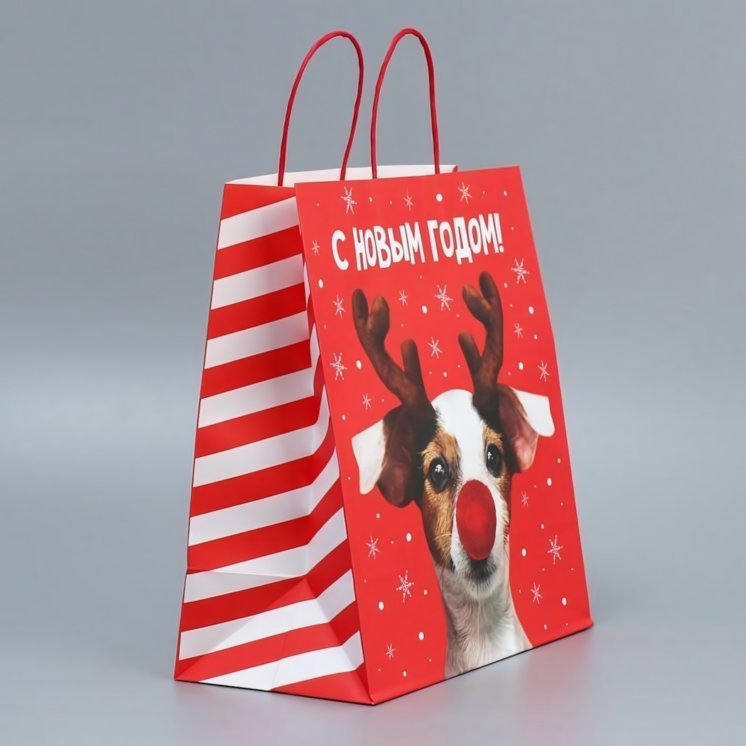 Праздничный пакет с оригинальным дизайном станет идеальным дополнением к вашему новогоднему сюрпризу. Яркое сочетание красного фона, белоснежных узоров и забавного олененка создает по-настоящему волшебное настроение!