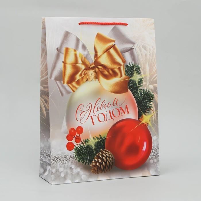 Пакет подарочный "Праздник для тебя", 28x38x9 см, новогодний дизайн, белая бумага, с ручками и бантом