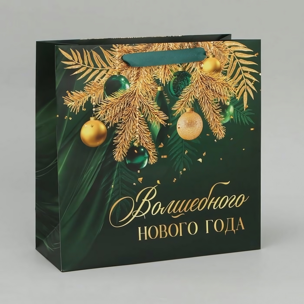 Создайте неповторимую атмосферу праздника с нашим подарочным пакетом "Emerald". Этот элегантный пакет, выполненный в темно-зеленом цвете с золотыми акцентами, станет идеальным дополнением к вашему новогоднему подарку. Золотые шары и хвойные ветви, изображенные на пакете, создают ощущение волшебства и предвкушения чуда.