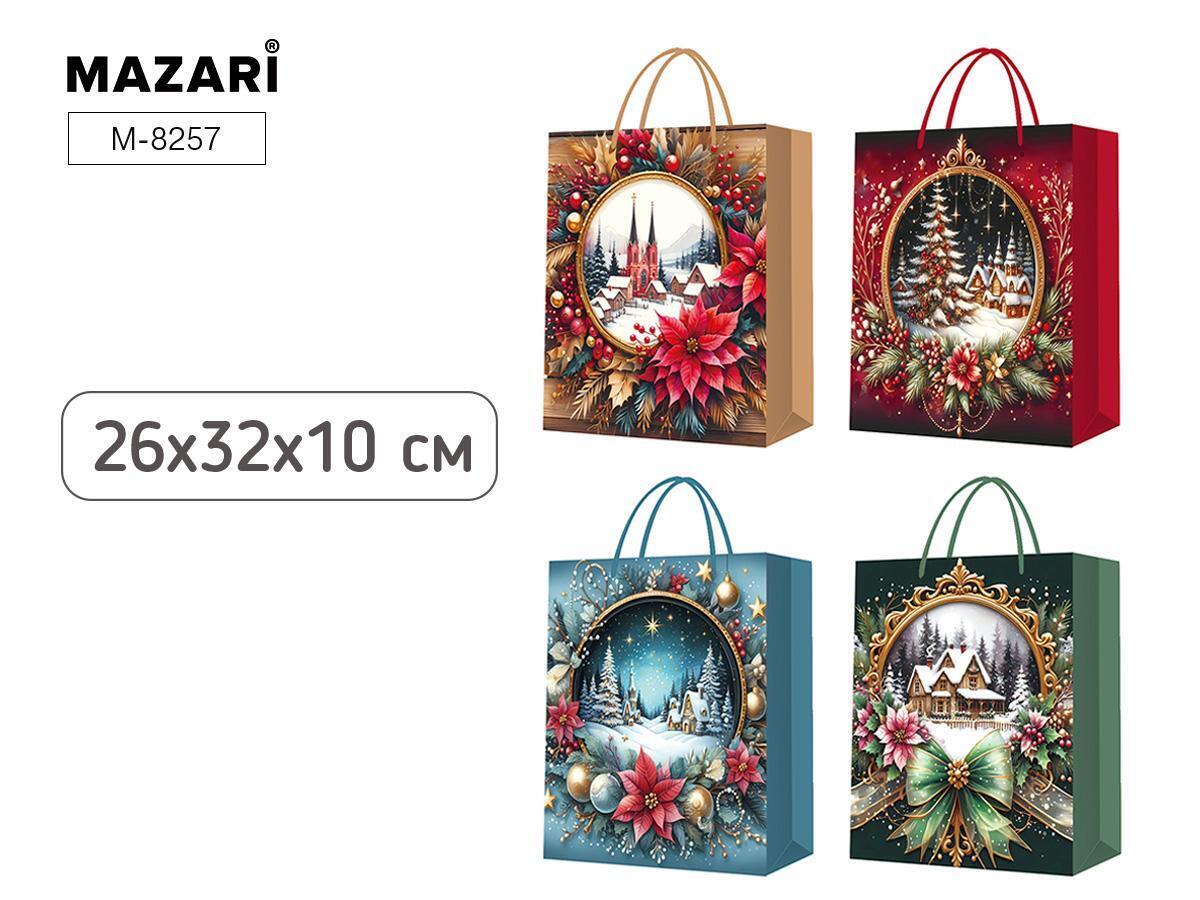 Пакет подарочный бумажный 26x32x10см, микс цветов, текстильные ручки, зимний праздничный дизайн, цвет в ассортименте