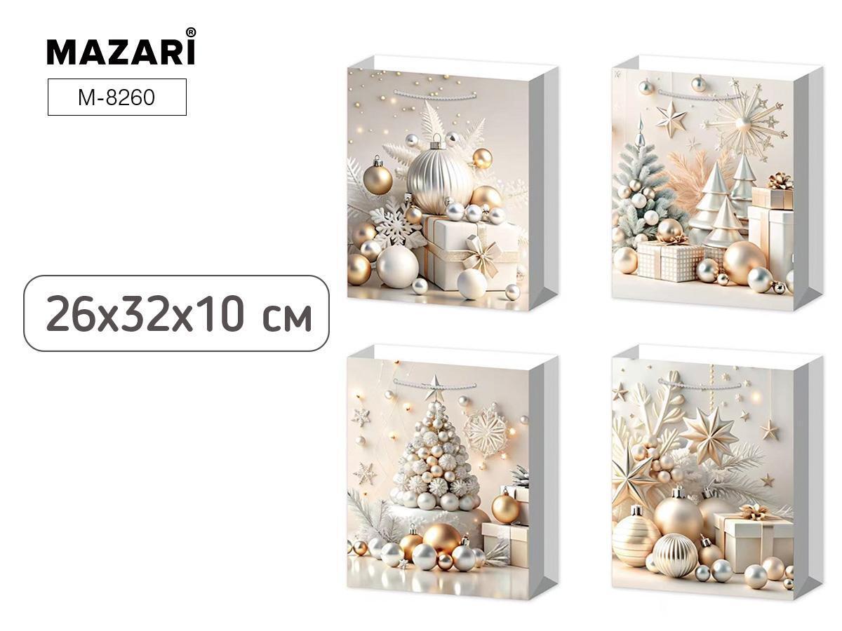 Добавьте ощущение праздника каждому презенту — этот бумажный пакет с новогодним оформлением создает атмосферу радости и уюта. Универсальный размер 26x32x10 см позволяет упаковать игрушки, сувениры, косметику, книги или сладости. Эффектные зимние элементы на каждом из четырёх дизайнов — ёлки, снежинки, шары — делают пакет ярким акцентом любого подарка.