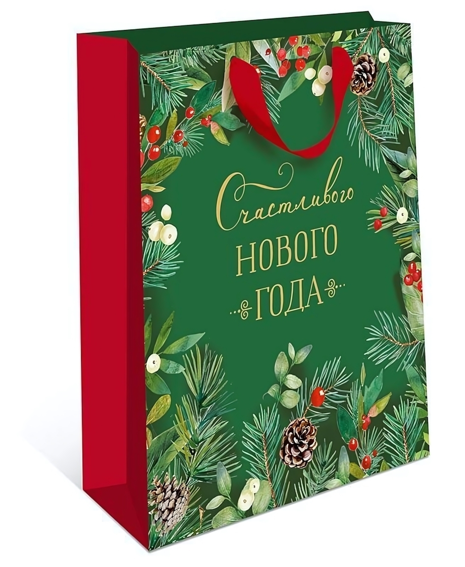 Этот красочный бумажный пакет станет идеальным дополнением к вашему новогоднему подарку. Яркий дизайн с еловыми ветками, шишками и красными ягодами создаст атмосферу волшебства и радости. Надпись «Счастливого НОВОГО ГОДА» добавит тепла и искренности вашему поздравлению.