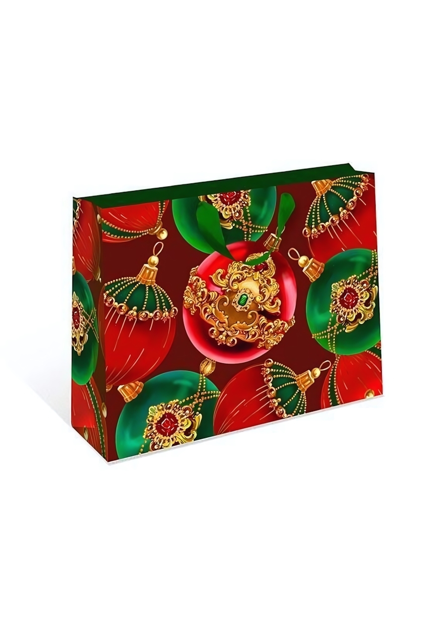 Яркий новогодний дизайн в традиционных красных и зеленых тонах с золотым декором превратит любой подарок в символ праздника. Прочная бумага повышенной плотности сохранит содержимое, а удобные ручки обеспечат комфорт при переноске.