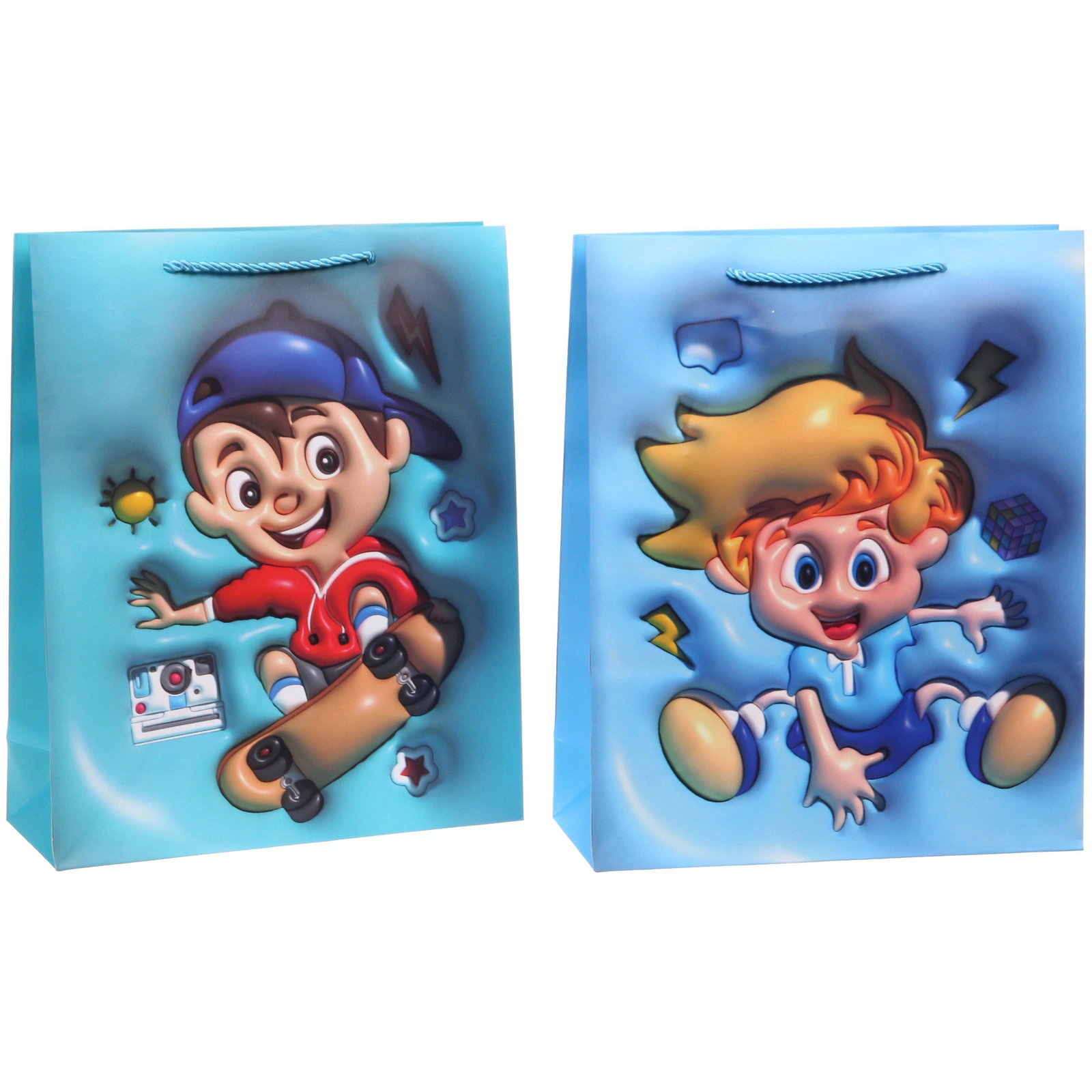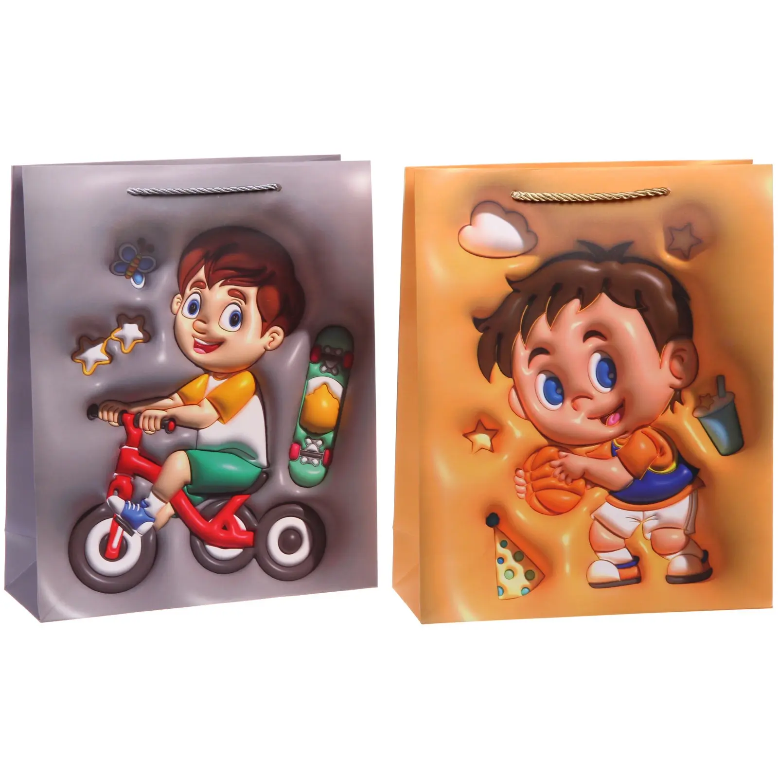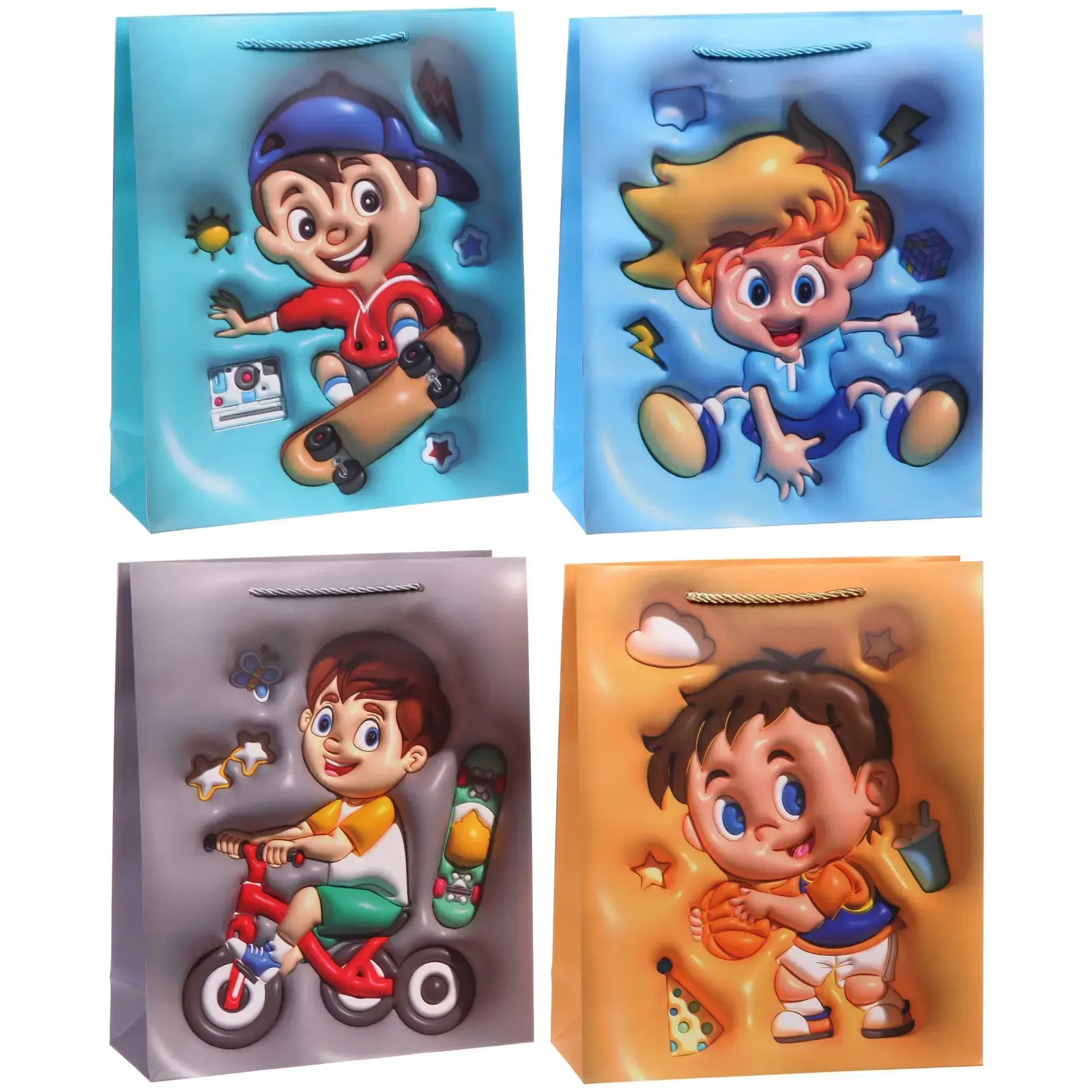 Пакет изготовлен из плотной бумаги, что обеспечивает его долговечность и способность держать форму. Ручки из нейлонового шнура делают переноску удобной и безопасной. Яркие мультяшные принты с изображениями мальчиков на скейтбордах, велосипедах и с мячами идеально подходят для детской тематики.