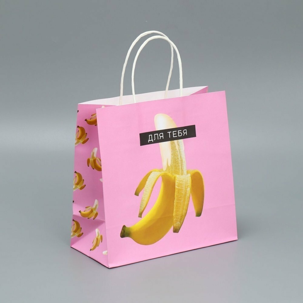 Пакет украшен игривым принтом с бананами и стильной надписью 'ДЛЯ ТЕБЯ'. Нежно-розовый цвет подходит для любого повода и пола получателя.