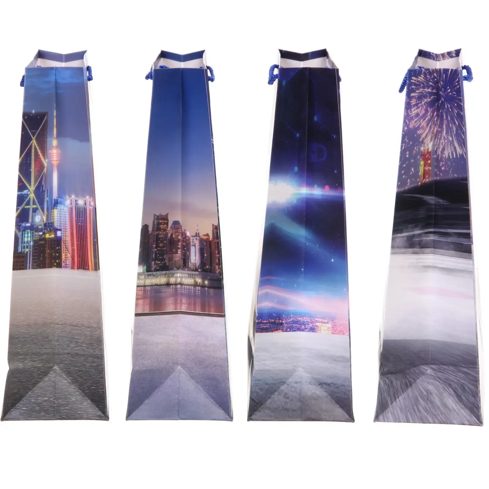Прямоугольная форма с жёстким дном позволяет устанавливать пакет вертикально для эффектной презентации. Боковые стенки украшены футуристическими спидометрами и элементами урбанистического пейзажа, создающими эффект движения. Цветовая гамма сочетает классические мужские оттенки с праздничными акцентами фейерверков.