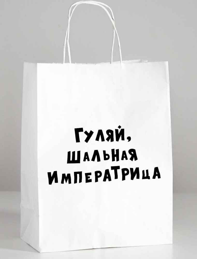 Почему стоит выбрать именно этот пакет? Во-первых, его яркий и запоминающийся дизайн с надписью 'Гуляй, шальная императрица' добавляет оригинальности и креативности. Во-вторых, белый цвет пакета делает его универсальным для любого повода, будь то день рождения, юбилей или просто приятный сюрприз. Кроме того, пакет изготовлен из качественного материала, что обеспечивает его долговечность и надежность.