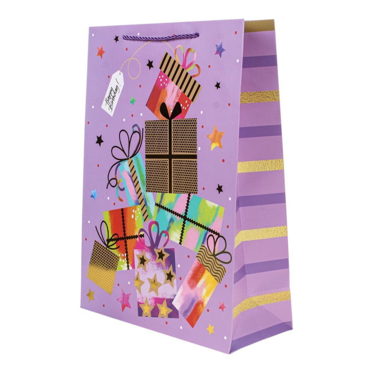 Подарочный пакет "Happy Birthday" 44х31х12 см, 4 дизайна, золотое тиснение, шнуровые ручки