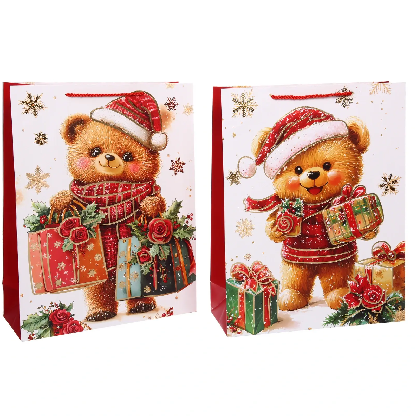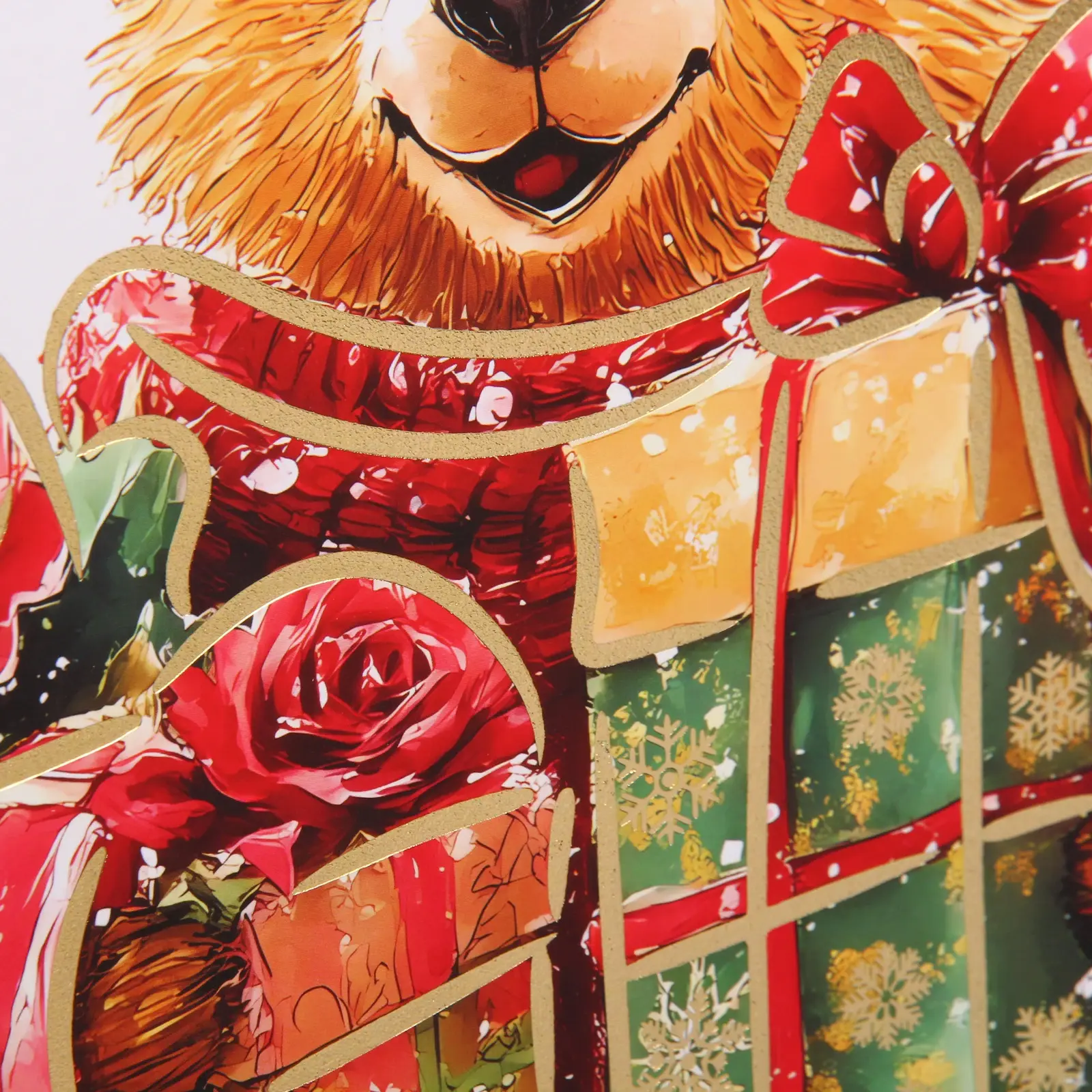 В ассортименте представлены четыре варианта с изображением очаровательных мультяшных медведей в праздничных костюмах. Каждый дизайн дополнен зимними элементами: снежинками, еловыми ветками и украшениями.