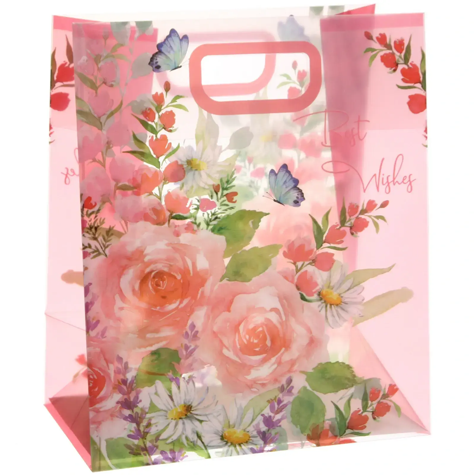 Практические детали: размер 25х15х30 см, прозрачный материал, украшен цветочным принтом и надписью «Best Wishes», оснащен удобной ручкой для переноски.