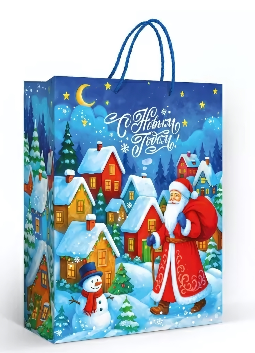 Этот ламинированный пакет формата L с зимним пейзажем поможет придать особый шарм вашему подарку. Яркие насыщенные цвета, сцена с домами, заснеженными крышами, луной, звёздами и хвойным лесом создают атмосферу волшебства. На передней стороне изображены добродушный персонаж в красной шубе, снеговик и праздничные украшения, а надпись «С Новым Годом!» добавляет теплого новогоднего настроения.