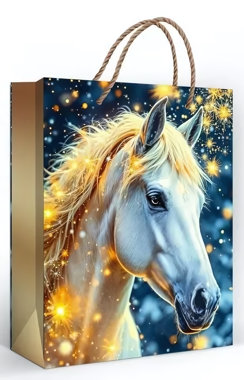 Пакет подарочный M с ламинацией 'Лошадь белая' — это стильное решение для упаковки ваших подарков. Его великолепный дизайн с изображением грациозной белой лошади и ярким звездным фоном создаёт атмосферу праздника и радости. Этот пакет станет отличным выбором, если вы хотите подчеркнуть важность и красоту подарка, который собираетесь вручить близким и друзьям.